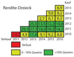 Dieser kleine Ausschnitt des Rendite-Dreiecks zeigt, dass der Kauf von Aktien nur für langfristig orientierte Anleger geeignet ist (Anlagehorizont >5 Jahre, besser >10 Jahre). Kurzfristige Investitionen in Aktien können durchaus zu Verlusten führen, wie beim DAX zuletzt im Jahr 2010 gesehen. Anleger, die ihr Kapital kurzfristig benötigen, sollten nicht in Aktien investieren. Bei Investition in eine einzelne Aktie ist im Extremfall - bei Insolvenz des Unternehmens - sogar der Verlust des gesamten eingesetzten Kapitals möglich.